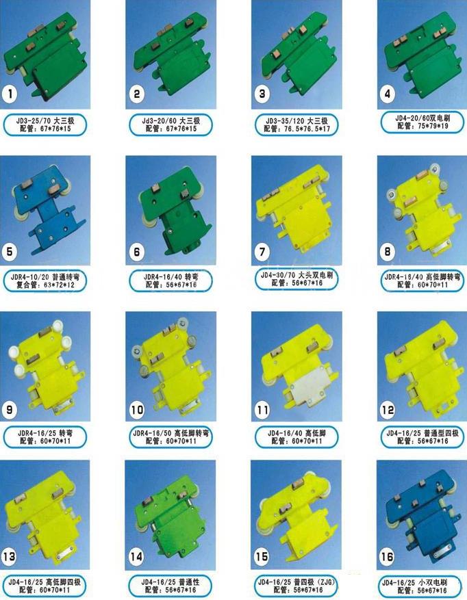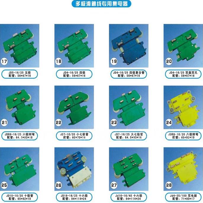 大三極、雙電刷、普通轉(zhuǎn)彎、轉(zhuǎn)彎、大頭雙電刷、高低腳轉(zhuǎn)彎、高低腳、多極集電器、多極滑觸線集電器普通型四極、高低腳四極、普通型、普四極、小雙電刷、五極、四極、雙蓋雙孔、六極轉(zhuǎn)彎、小七極管、大七極管、八極轉(zhuǎn)彎、十極管、十六極、防塵雙電刷、大四極、四線插座多極滑觸線集電器。